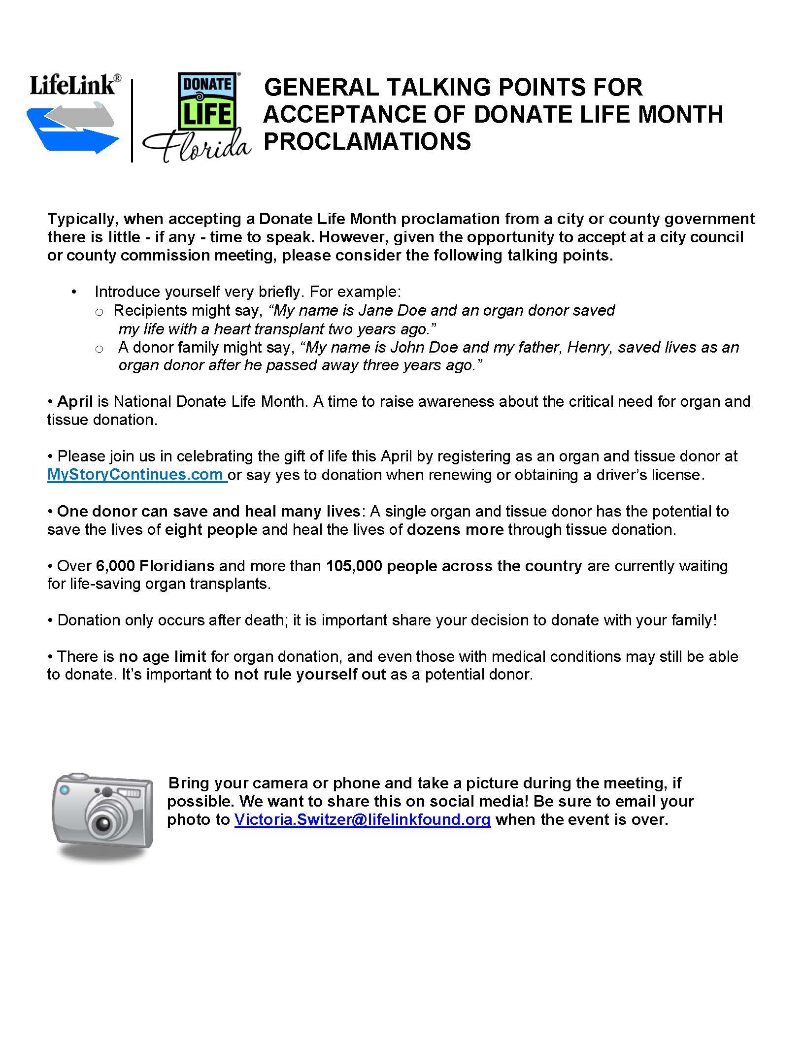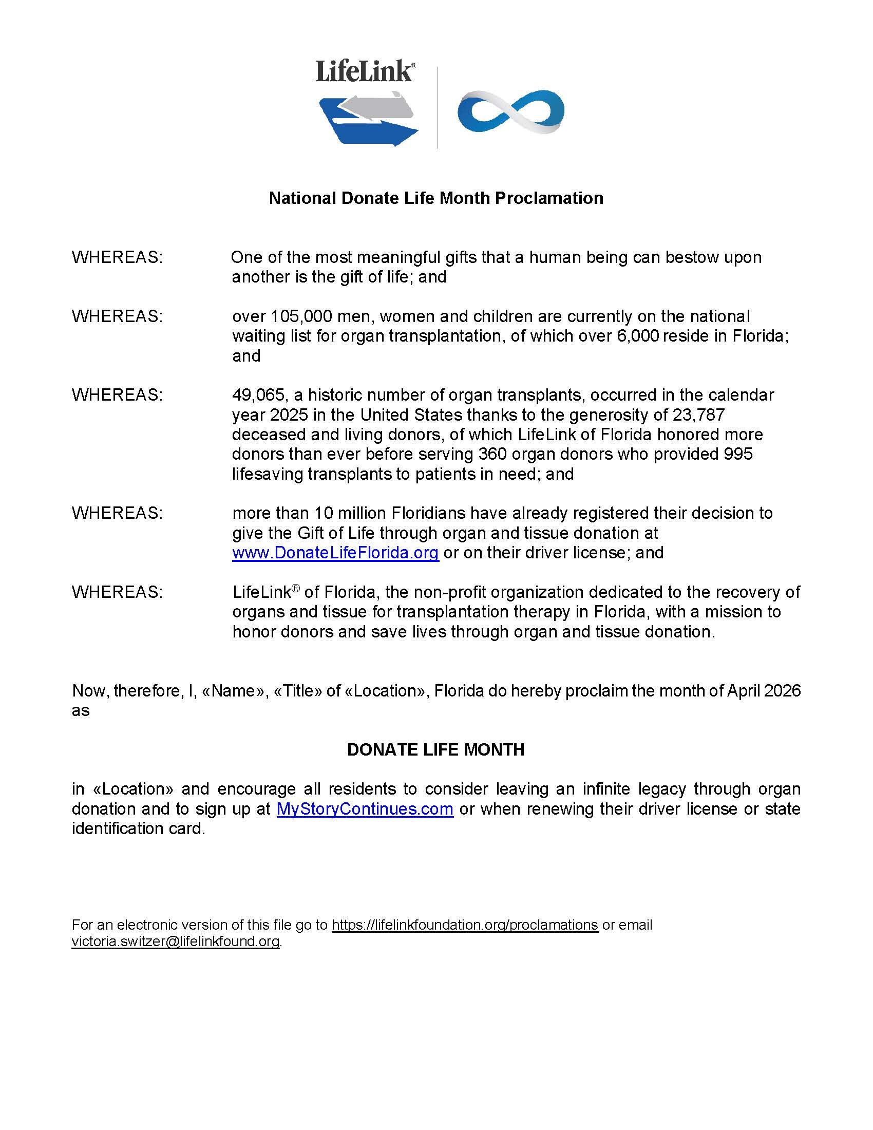 We are looking for an Ambassador to attend the City of Davenport meeting to accept the Donate Life Month proclamation on Monday, April 6th at 7:00 pm at 1 South Allapaha Avenue Davenport, FL 33837.